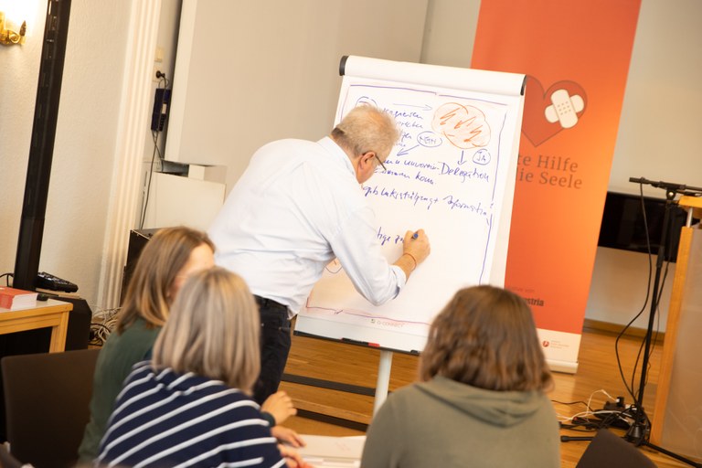 Geschulte Instruktor*innen vermitteln in einem 12 stündigen Seminar Wissen über Krankheitsbilder sowie Kenntnisse zur Gesprächsführung, sodass man gerüstet ist, Kolleg*innen und Mitmenschen in einer psychischen Krise beistehen zu können.